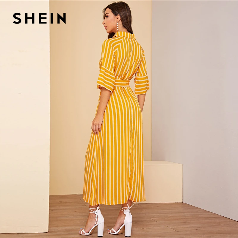 Shein Abaya Jaune Raye Imprime Bouton Ceinture Demi Placket Maxi Robe Modeste Femmes Ete Automne Bureau Dame Une Ligne Robes Aliexpress