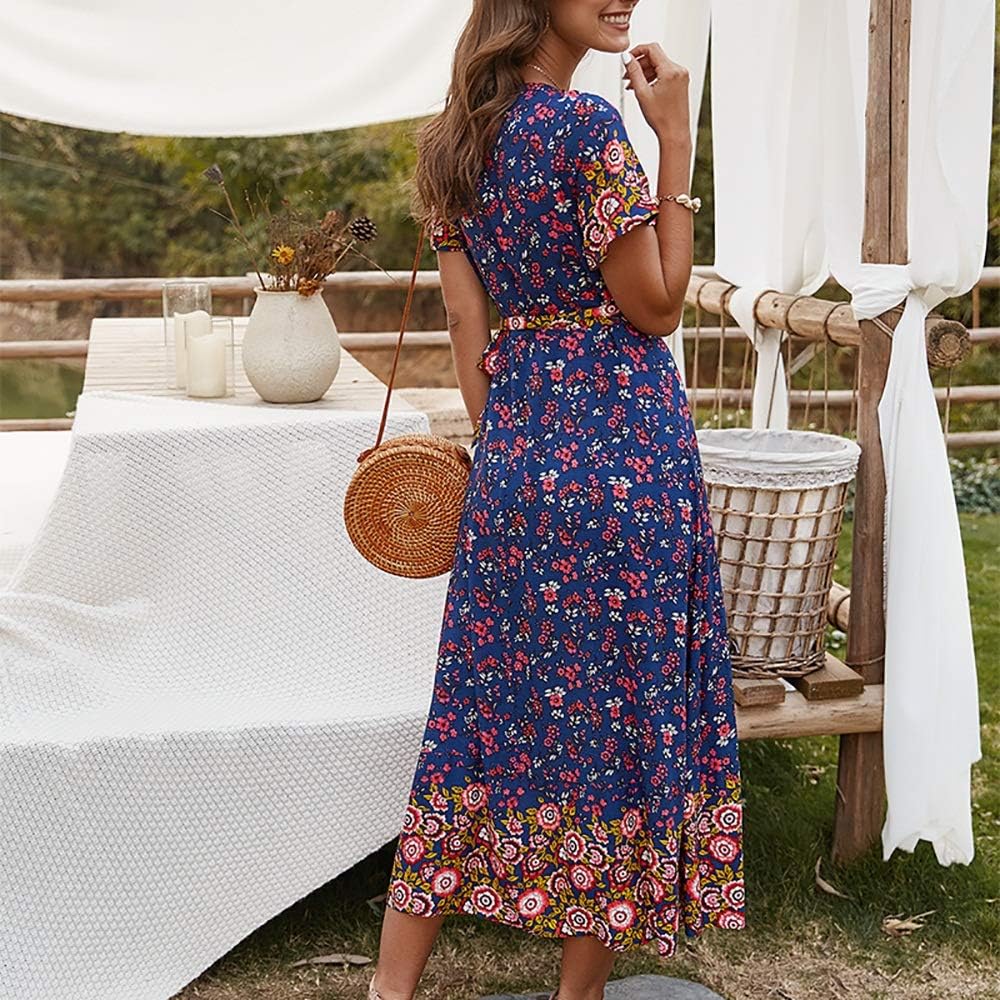 Kanqingqing Robes Pour Femmes Femmes A Manches Courtes Floral Maxi Robes D Ete Casual Robe Imprimee Col V Taille Haute Robes Longues Color Dark Blue Size M Amazon Fr Cuisine Maison